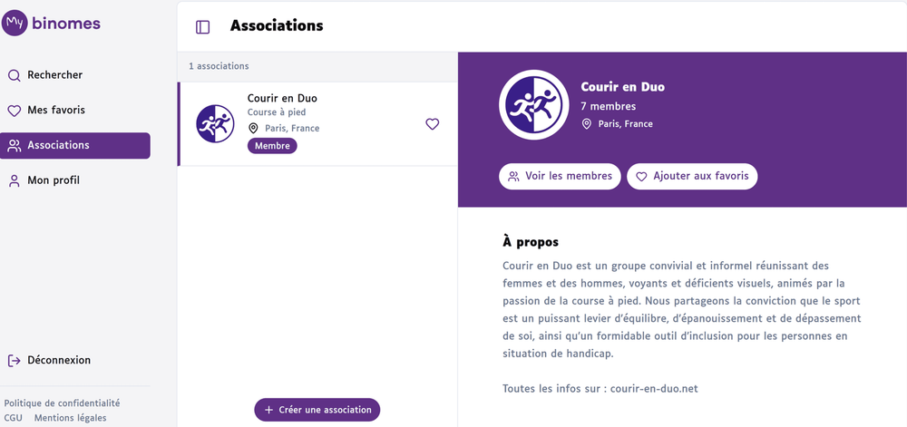 Les clubs et associations handisports sont essentielles pour développer la pratique du sport partagé. Nous avons souhaité pouvoir les mettre en avant et mettre en avant leurs membres. Ainsi, si vous faites partie d’un club ou d’une association handisport, n'hésitez pas à la créer depuis la rubrique Associations. L’appartenance à un club ou une association handisport remontera sur le profil des membres, c’est aussi un élément de réassurance pour quelqu’un qui chercherait un binôme et qui n’aurait pas d’expérience de sport en binôme.