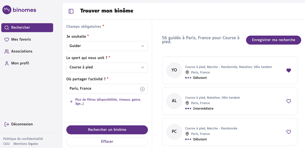 BINOMES lance My binomes, un tout nouveau site my.binomes.org qui va simplifier la recherche de binômes pour la pratique de sport partagé. Ce site a vocation à évoluer, s’enrichir de nouvelles fonctionnalités pendant toute l’année 2026. Voici les principales évolutions pour le mois de Décembre 2025 :