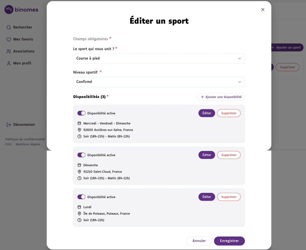 My Binomes vous permet d’avoir une gestion beaucoup plus fine de vos préférences à travers la fonction “Disponibilités” . Ainsi pour chaque sport, vous avez la possibilité de créer une ou plusieurs disponibilités.